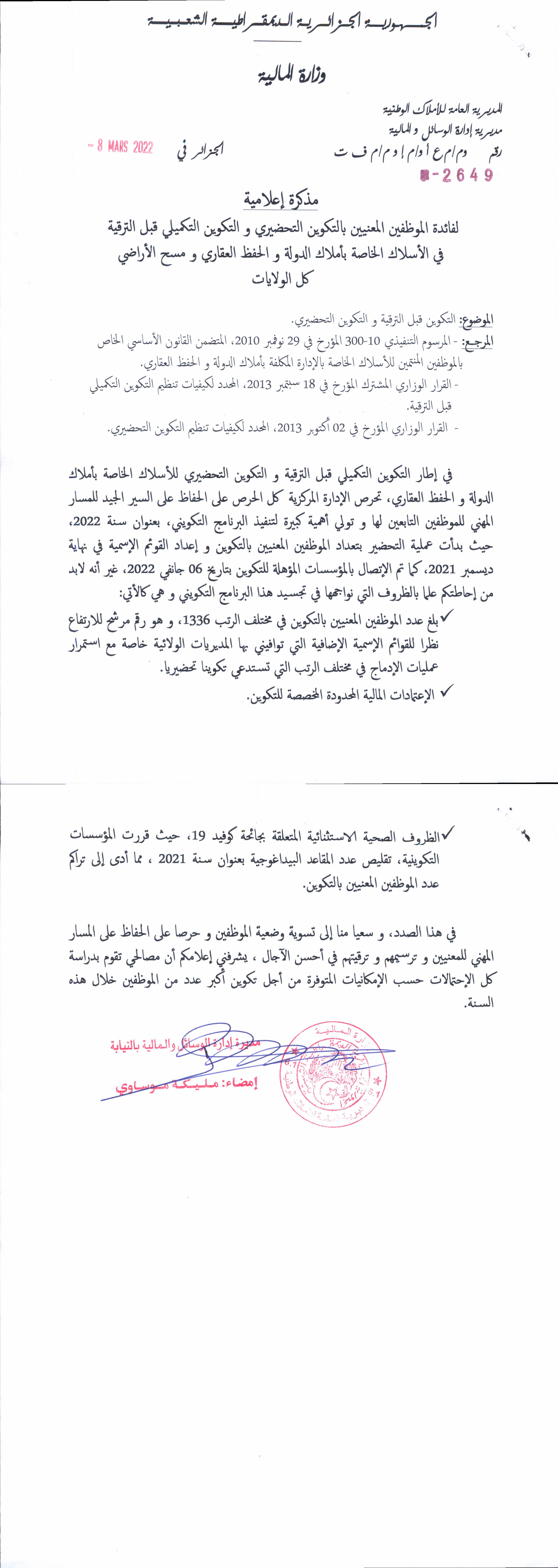 Note d'information relative aux formations statutaires au profit des fonctionnaires appartenant aux corps spécifiques de l'administration chargée des domaines.